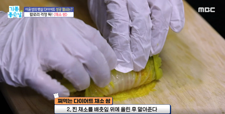 3. 찐 채소를 배춧잎 위에 올린 후 말아준다.