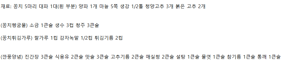 8. 7에 고추기름, 진간장, 맛술, 매실청, 설탕을 넣어서 튀긴 꽁치를 넣어 버무리면서 센 불에서 볶는다.