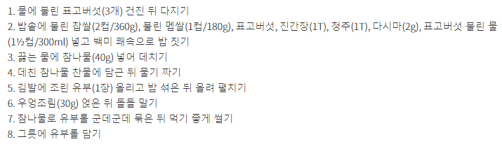 최고의 요리비결 김정은의 감태김말이와 오징어해초무침 레시피 어떻게 만드는지 알아보겠습니다. 만드는 방법 1. 전기밥솥에 불린 멥쌀 3컵 550g, 소금 1t, 다시마 2g, 채 썬 생강 30g, 물 2 1/2컵