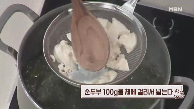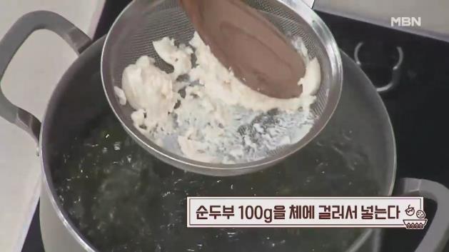 9. 순두부 100g을 체에 걸러서 넣는다.