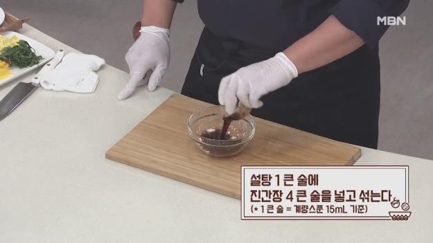 7. 설탕 1큰 술에 진간장 4큰 술을 넣고 섞는다. (1큰술 = 계량스푼 15ml 기준)