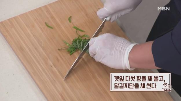 5. 깻잎 다섯 장을 채 썰고 달걀지단을 채 썬다.