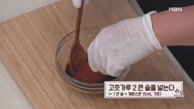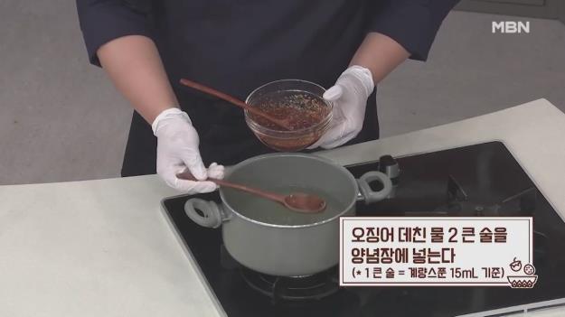 12. 오징어 데친 물 2큰술을 양념장에 넣는다.