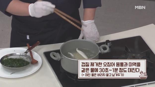 3. 껍질을 제거한 오징어 몸통과 미역을 같은 물에 30초 ~ 1분 정도 데친다. (데친 물은 버리지 말고 남겨둔다.)