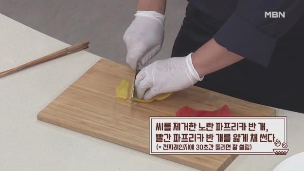 4. 씨를 제거한 노란 파프리카 반 개, 빨간 파프리카 반 개를 얇게 채 썬다.