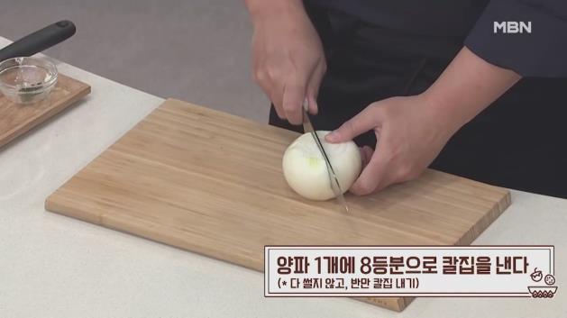5. 양파 1개에 8등분으로 칼집을 낸다. (다 썰지 않고 반만 칼집을 낸다.)