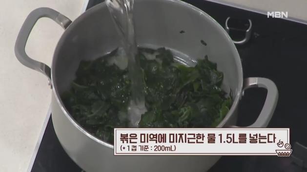4. 볶은 미역에 미지근한 물 1.5리터를 넣는다. (1컵 기준 200ml)