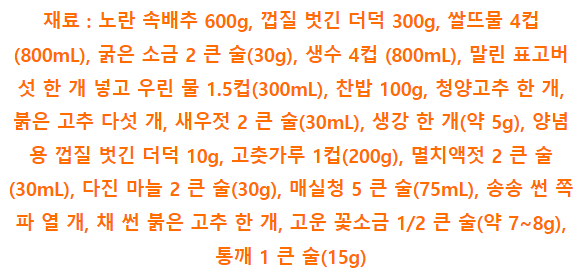 | 1. 노란 속배추 600g을 먹기 좋은 크기로 찢어준다. 2. 유리 볼에 생수 4컵을 붓고 굵은 소금 2큰 술을 넣어 녹인다. (1컵 기준 200ml/ 1큰술 = 계량스푼 15ml 기준) 3. 소금물에 찢은 배추를 넣고 3분 정도 헹군 후 꺼내서 체에 밭쳐둔다. 4. 유리 볼에 쌀뜨물 4컵을 붓고 껍질을 벗긴 더덕을 헹군다. 쌀뜨물에 헹군 더덕을 소금물에 넣고 1분 정도 비벼가며 헹군 후 방망이로 더덕을 살살 두드린다. 5. 믹서에 표고버섯 한 개를 30분간 우린 물 1.5컵을 넣고 홍고추 다섯개 청양고추 한 개, 엄지손톱 크기의 생강, 찬밥 100g, 더덕 한 개 10g, 새우젓 2큰 술을 넣고 갈아준다. 6. 믹서에 간 재료를 양푼에 붓고, 고춧가루 1컵을 넣고 섞는다. 7. 양념이 담긴 양푼에 배추, 더덕, 송송 썬 쪽파 열 개, 채 썬 홍고추 한 개를 넣고 버무린 후 꽃소금 1/2큰술, 통깨 1큰 술을 넣고 버무린다. |
