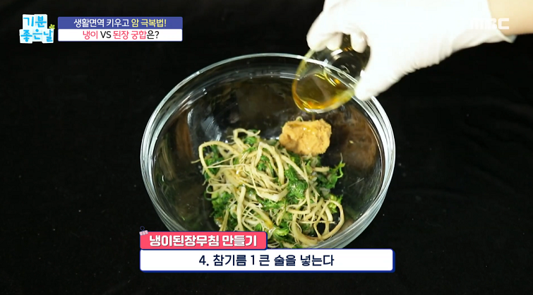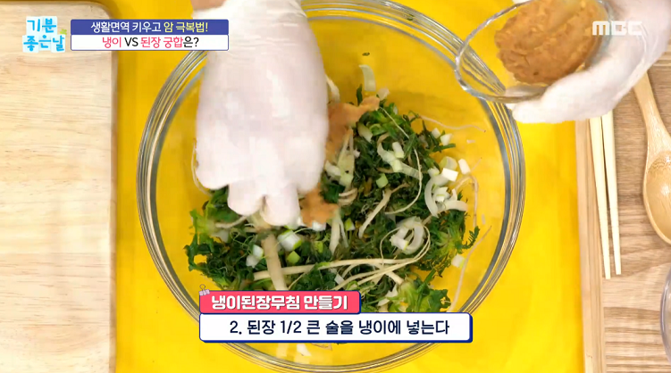 2. 된장 1/2큰 술을 냉이에 넣는다.