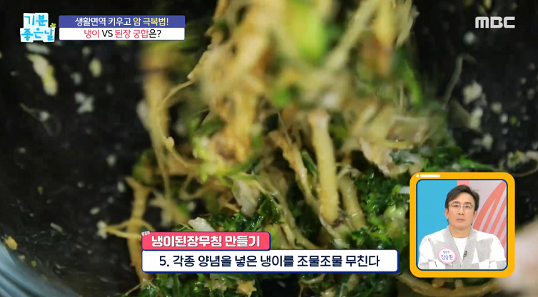 5. 각종 양념을 넣은 냉이를 조물조물 무친다.