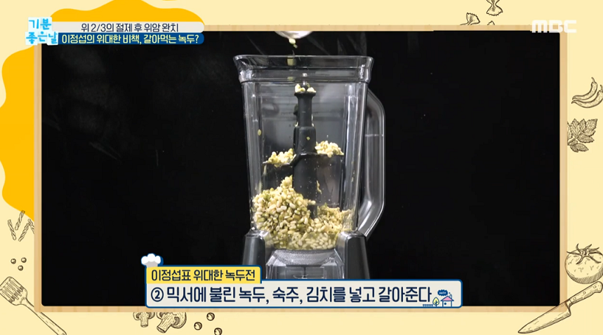 2. 믹서에 불린 녹두, 숙주, 김치를 넣고 갈아준다.