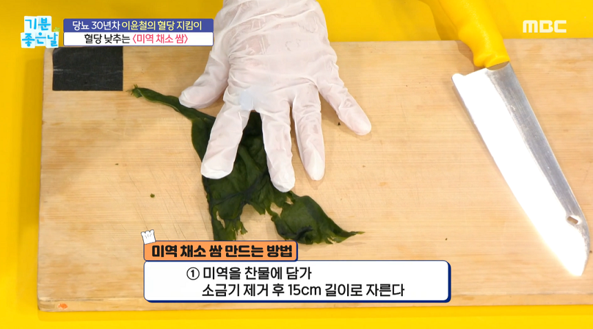 1. 미역을 찬물에 담가 소금기를 제거 후 15cm 길이로 자른다.