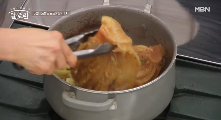 2. 양념한 묵은지에 다시팩과 물을 넣고 20분간 끓인다.
