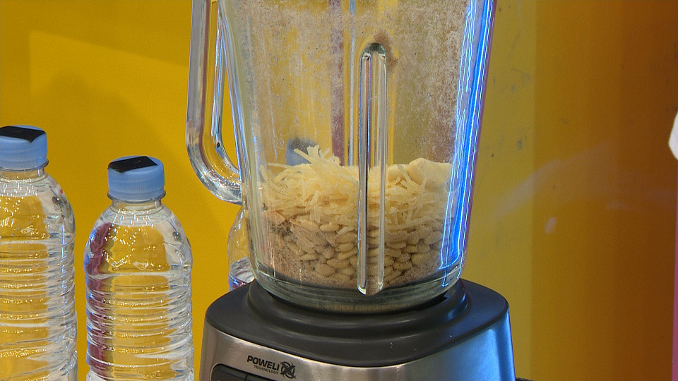 4. 멸치 가루에 잣, 파마산 치즈, 마늘, 데친 냉이와 시금치, 올리브오일, 들기름을 모두 넣고 잘 갈아서 멸치 페스토를 만든다.