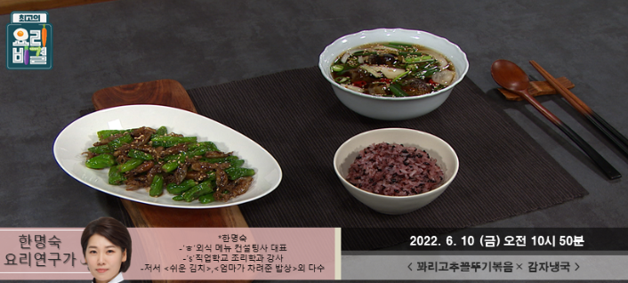 최고의 요리비결 한명숙의 청국장보리비빔밥과 오이미역냉국 레시피가 어떻게 되는지 알아보겠습니다. 한명숙의 여름배추김치와 참외샐러드 레시피 한명숙의 여름배추김치와 참외샐러드