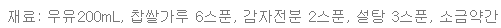 1. 팬에 우유 200ml에 찹쌀가루 6스푼, 감자전분 2스푼, 설탕 3스푼, 소금을 약간 넣는다.