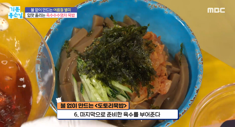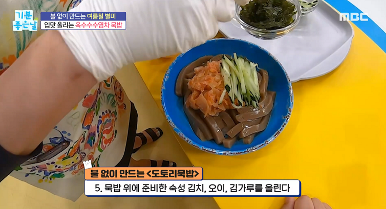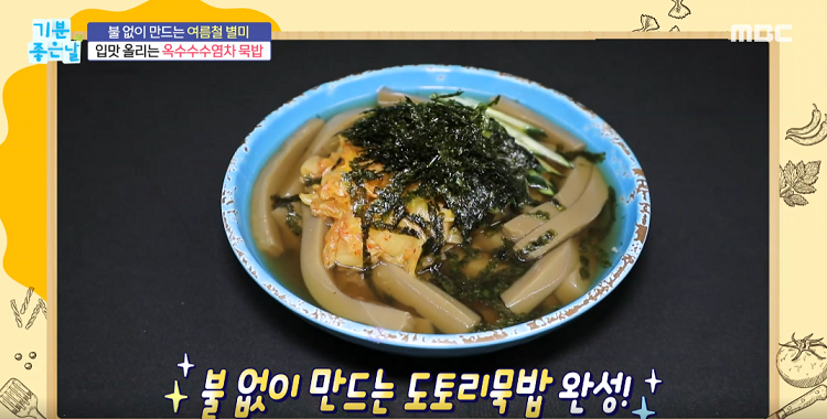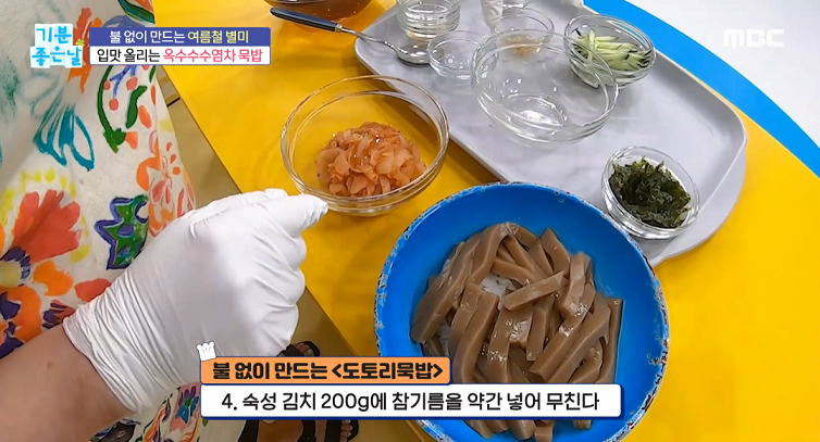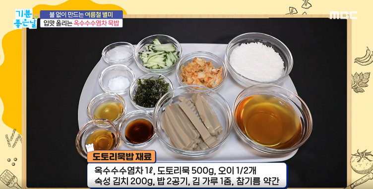 옥수수수염차 1리터, 도토리묵 500g, 오이1/2개, 숙성김치 200g, 밥2공기, 김가루 1줌, 참기름 약간