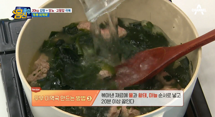 3. 볶아낸 재료에 물과 황태, 마늘 순서로 넣고 20분 이상 끓인다.