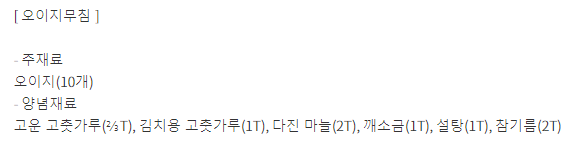 3. 물기 짠 오이지에 고운 고춧가루 2/3t, 김치용 고춧가루 1t, 다진마늘 2t, 깨소금 1t, 설탕 1t, 참기름 2t를 넣어 버무린다.