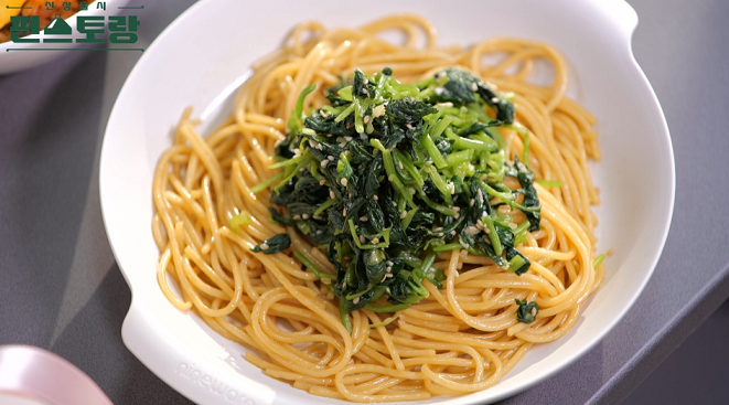 8. 그릇에 양념한 스파게티면을 담고 참나물 100g을 올려주면 끝