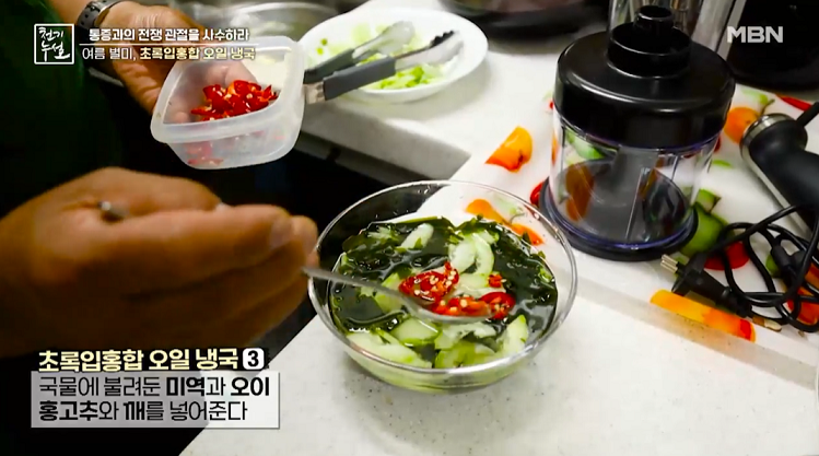 3. 국물에 불려둔미역과 오이, 홍고추와 깨를 넣어준다.