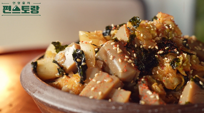 3. 볼에 썰어둔 묵은지, 도토리묵, 간장 2t, 설탕 2t, 들기름 10t, 깨2t, 부순 조미김을 넣고 잘 섞어준다.