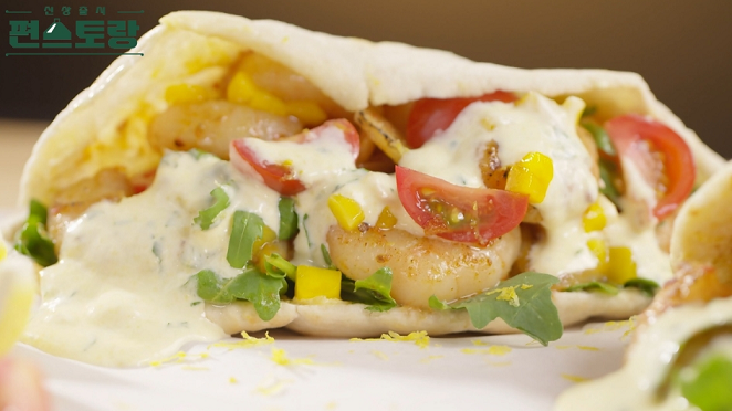 편스토랑 류수영 망고 새우 포켓빵 망고 코코넛 요거트 레시피 레시피가 어떻게 되는지 알아보겠습니다. 1. 약불로 달군 팬에 해동한 피타 브레드 2장을 1분 동안 뒤집어가며 데우듯이 구