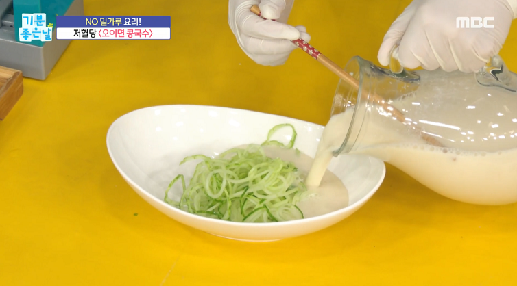 4. 만든 오이면을 접시에 담고 콩국수를 붓는다.