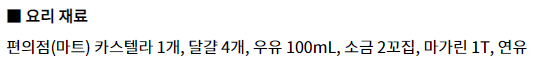 + 너무 촉촉한 카스텔라로 하면 나중에 모양이 무너질 수 있기 때문에 편의점이나 마트에서 판매하는 카스텔라를 사용하게 좋다.