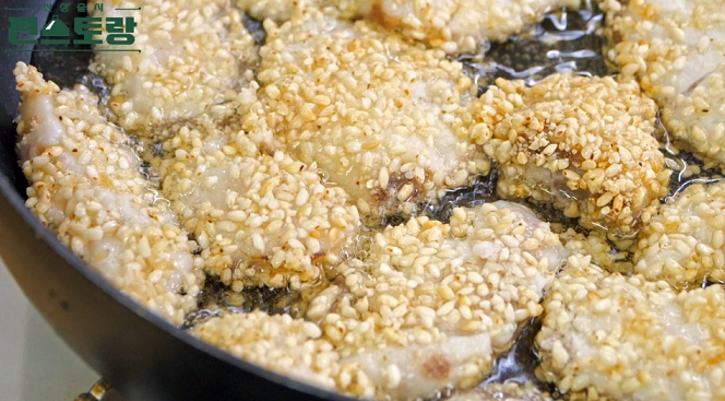 5. 밑간 한 민어포 겉면에 달걀흰자를 아주 살짝 묻힌 뒤 볶은 생쌀을 입힌다.