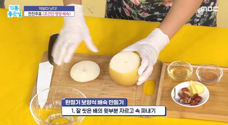 1. 잘 씻은 배의 윗부분을 자르고 속을 파낸다.