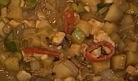 3. 볶은 양념에 호박 1/3개, 양파 1/2개, 표고버섯 2장, 대파 1/6대, 홍고추 1개, 청양고추 2개, 두부 150g을 넣는다.