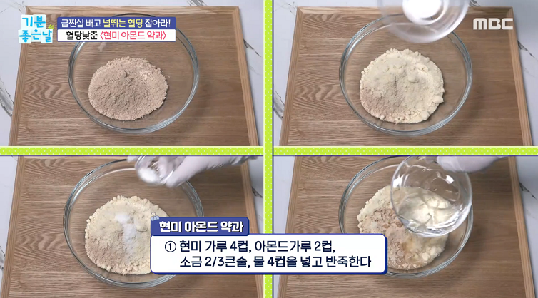 1. 현미가루 4컵, 아몬드가루 2컵, 소주 2/3큰술, 물 4컵을 넣고 반죽한다.