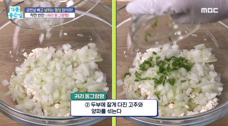 2. 두부에 잘게 다진 고추와 양파를 섞는다.