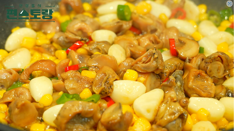 6. 재료들이 지글지글 익어가면 콘 옥수수 150g과 오리고당 1t를 한 바퀴 뿌려 볶는다.