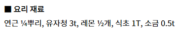 3. 2의 연근에 유자청 3t를 넣고 무치고, 레몬 반개 즙을 뿌려 잘 섞어주면 끝