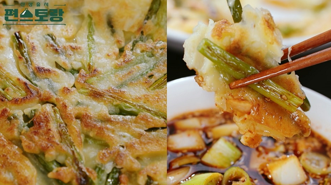 4. 달군 팬에 오일을 두른 후 섞은 마늘종전 반죽을 넓게 펼쳐 앞뒤로 노릇하게 구워준다.