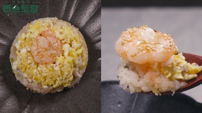11. 밥그릇에 볶은 통새우 ㅡ> 달걀 스크램블 ㅡ> 볶음밥 순서로 담아 모양을 잡고 접시로 덮은 뒤 뒤집는다.