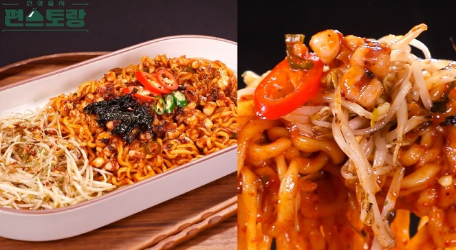 6. 그릇에 라면을 옮겨 담고 볶아둔 숙주를 올린 뒤 토치로 불맛을 입힌다.