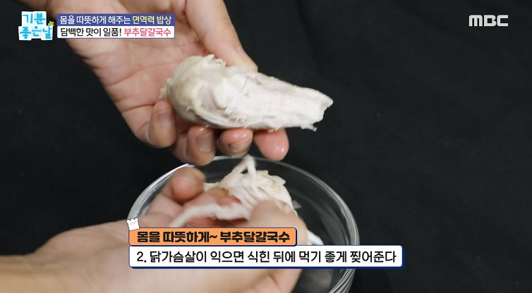 2. 닭가슴살이 익으면 식힌 뒤에 먹기 좋게 찢어준다.