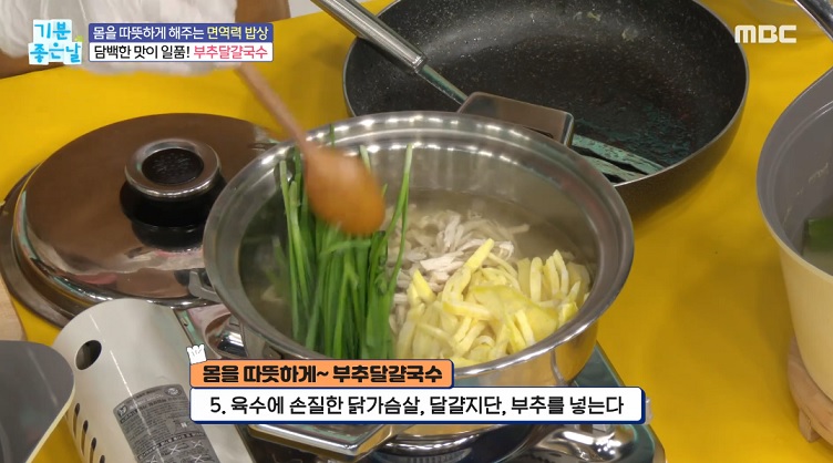 5. 육수에 손질한 닭가슴살, 달걀지단, 부추를 넣는다.