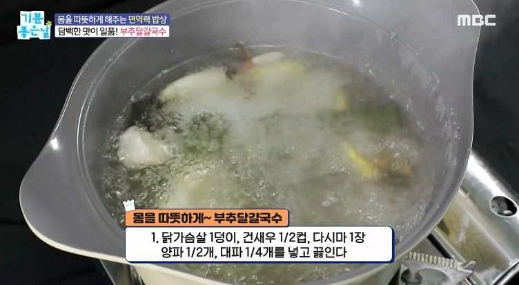 1. 닭가슴살 1덩이, 건새우 1/2컵, 다시마 1장, 양파 1/2개, 대파 1/4개를 넣고 끓인다.