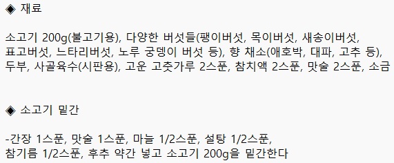 1. 소고기 불고기용을 밑간한 후 다양한 버섯과 향 채소, 두부를 기호에 맞게 냄비에 올린다.