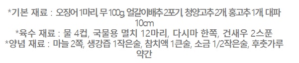 1. 오징어는 껍질째 한입 크기로 썰고 물 4컵에 국물용 멸치 12마리, 다시마 한쪽, 건새우 2스푼을 넣고 물이 끓으면 다시마를 건져낸 뒤 15분 더 끓여 육수를 만든다.
