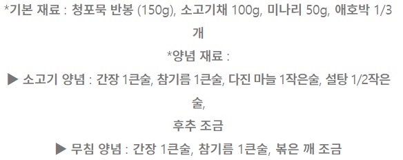 1. 청포묵은 새끼손가락 굵기로 채 썰어 준 뒤 끓는 물에 투명해질 때까지 데친 후 채반에 건진 뒤 찬물에 헹궈 물기를 빼준다. (2~3분)