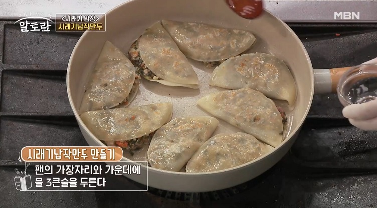 4. 식용유 두른 팬에 만두를 노릇하게 구워주고 팬 가장자리에 물을 1~2큰술을 두른 뒤 뚜껑을 덮고 약불에서 1분간 더 익히며 마무리한다.