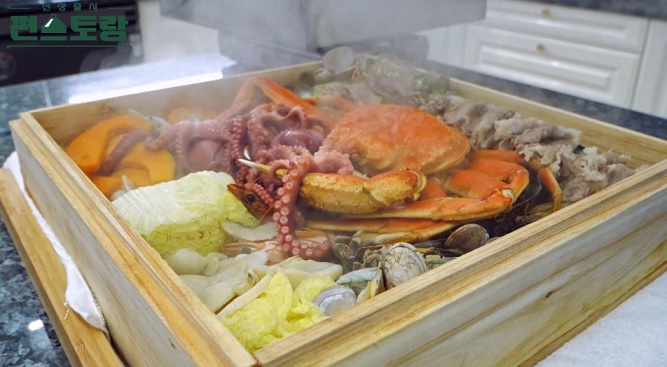 10. 이어서 해산물 재료들을 모두 담은 찜기에 담고 맨 위에 산낙지를 올려준다.