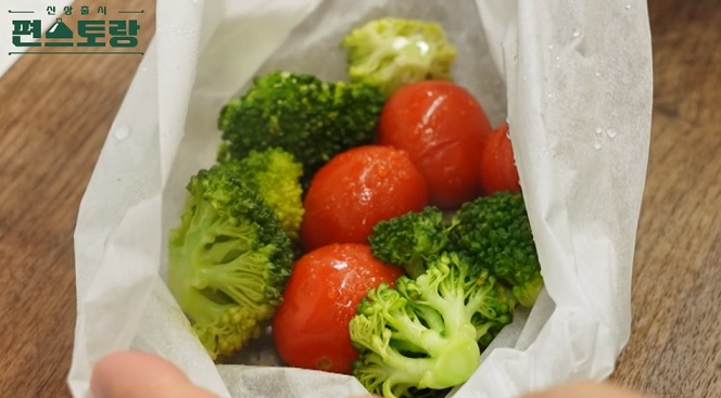 2. 종이호일에 넣은 브로콜리, 방울토마토를 프라이팬에 올리고, 중불에서 뚜껑을 덮고 10분 동안 익힌다.