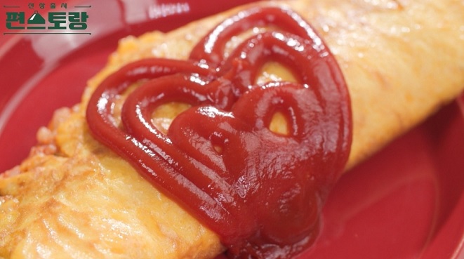 6. 완성된 오므라이스에 케첩을 뿌려 마무리한다.