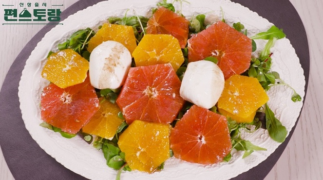 4. 오렌지와 자몽을 번갈아 가며 놓고 중간중간 부라타 치즈를 놓는다.